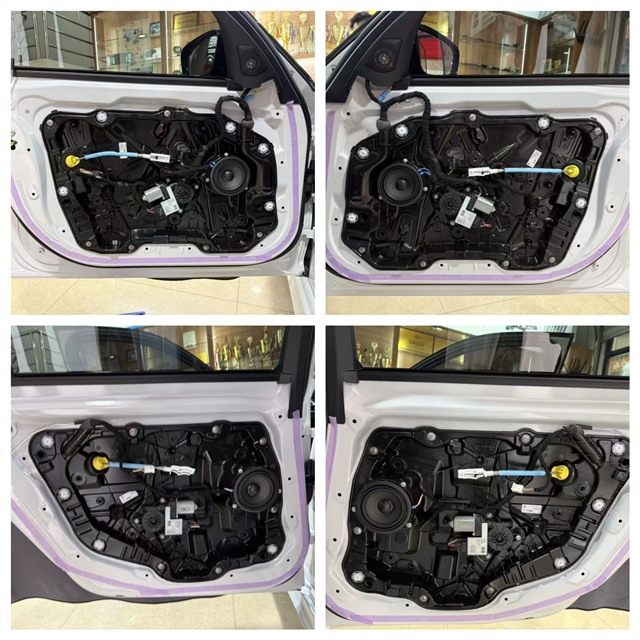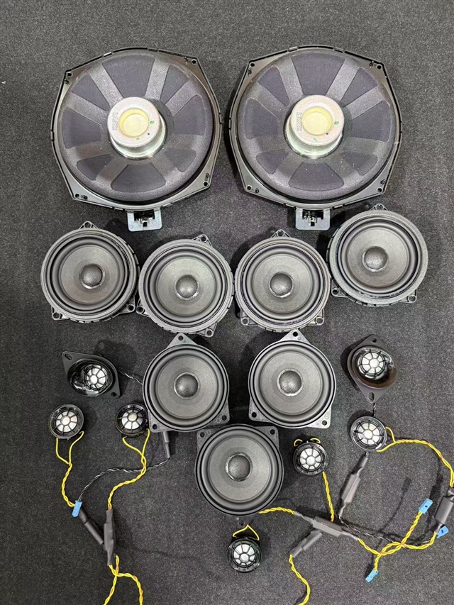 本次升级方案所有器材均为宝马专车专用。核心配置方面,选用弗莱德FP-16AD处理器作为音频中枢,搭配两台欧迪臣AF系列功放——AF M4D与AF M6D,再辅以凯博菲丽高品质音频线,确保音频传输纯净无损耗,为喇叭提供稳定充足的功率支撑。为更直观地让车友们看到宝马330Li原车不足,将拆开每个动作都拍照,技师先将原车前后门板拆开,露出原车中音喇叭,同时拆卸原车中置、后环绕及中低音喇叭,16只原车喇叭全部拆出后合影可见,其用料普通、做工粗糙,与劲浪专用喇叭形成鲜明对比。