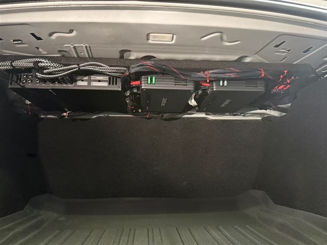 后门板与后环绕喇叭也均按原位替换安装,安装完成后仔细还原门板与内饰,做到无改装痕迹。两台欧迪臣功放与弗莱德DSP则吊装于尾箱顶部,简易安装且不占用尾箱储物空间,兼顾实用性与美观度。