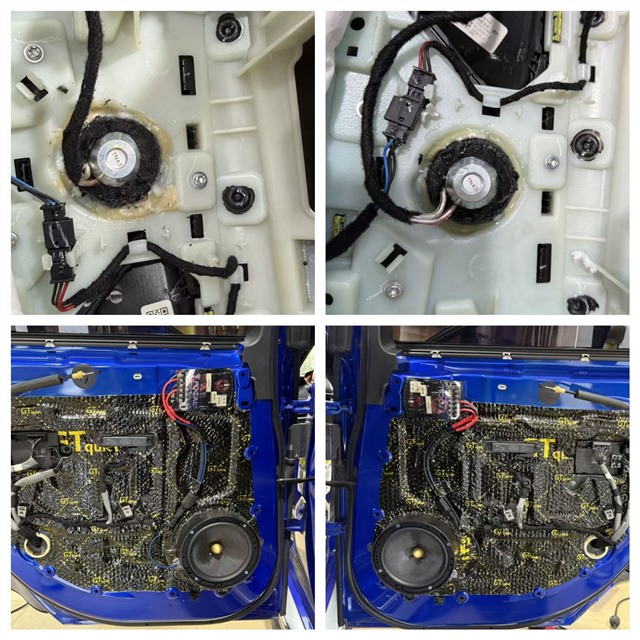 前声场选用法国劲浪ES165K两分频,这套源自法国的音响利器搭载凯夫拉纤维振膜,兼具轻量化与刚性优势,能精准还原动态细节。技师将高音单元原位嵌入仪表台两侧,与原车内饰无缝融合;中低音则在门板完成GT双层隔音后安装——内层止振垫抑制钣金共振,外层密封形成密闭音腔,为喇叭搭建稳定发声环境。