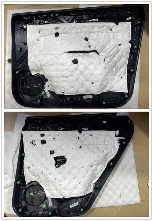 隔音改装的关键在于选择合适的隔音材料。在此次改装中,改装师选择了大能隔音品牌对四门进行隔音处理。第一层采用大能红派,具有优异的减震、隔热、防锈以及钣金强化性能,第二层施工则进一步提升了隔音效果,第三层配备了超级温莎棉,有效吸收共鸣噪音,阻隔热能,同时降低能耗。