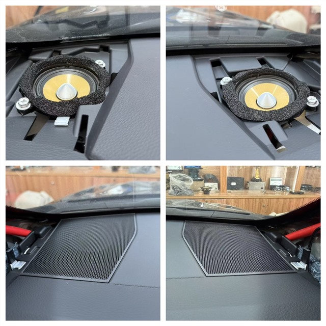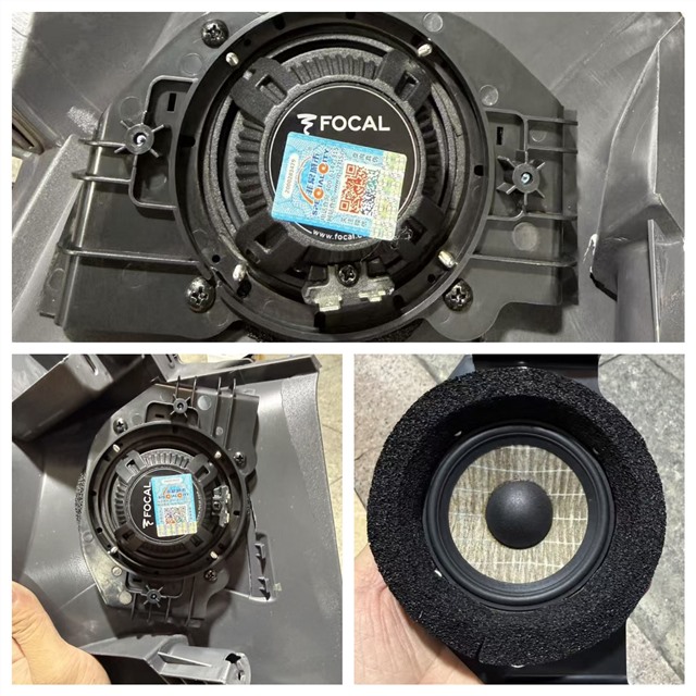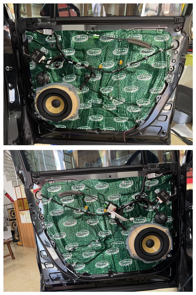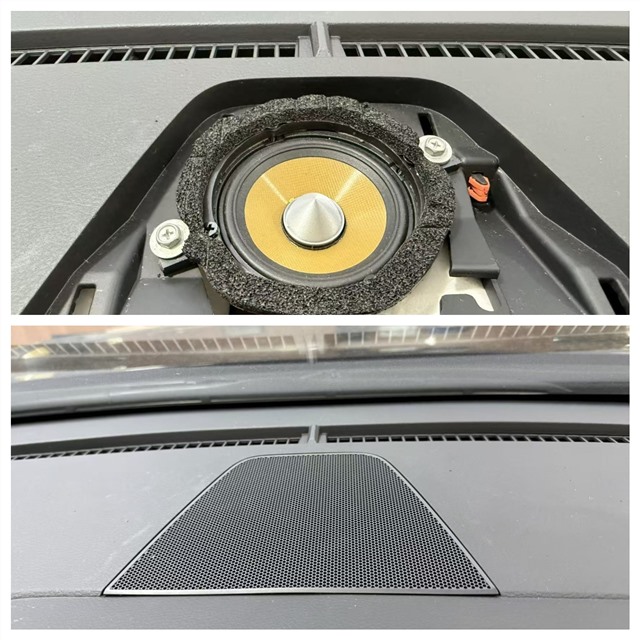 在前门板处理上,首先对门板进行大能隔音施工,有效阻隔行车过程中的外界噪音,为喇叭营造安静的工作环境。随后,将劲浪黄盆KX3三分频的中低音单元精准安装到位,确保喇叭与门板贴合紧密,避免共振影响音质。三分频的高音单元则采用A柱倒模工艺安装,让声场定位更精准,同时倒模造型与原车内饰完美融合,毫无违和感。三分频的中音单元则巧妙安装在仪表台两侧,进一步完善了前场声场的层次感。